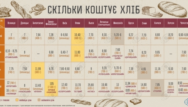 Ціна хлібу за роки незалежності значно зросла. Якщо у 1992 році він коштував 1,5 купона-карбованця, у 1996 році – 52 копійки, то сьогодні за нього доведеться викласти цілих 11,47 грн. Мова йде саме про житній або житньо-пшеничний хліб. Для зручності підраховано ціну за 1 кг хлібу.