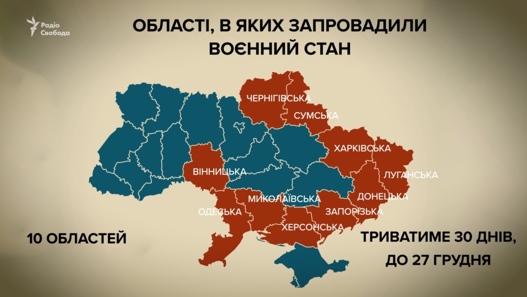 Воєнний стан може вводитися на території цілої держави або в окремих її регіонах. Це має бути чітко зазначено в президентському указі. У законі не вказується тривалість воєнного стану – термін його дії має бути зазначено в указі президента.’);}],[{id:’R7pxaOikE5S1vr0PtauUqA0__49′},function(){window.jsl.dh(‘R7pxaOikE5S1vr0PtauUqA0__49′,’